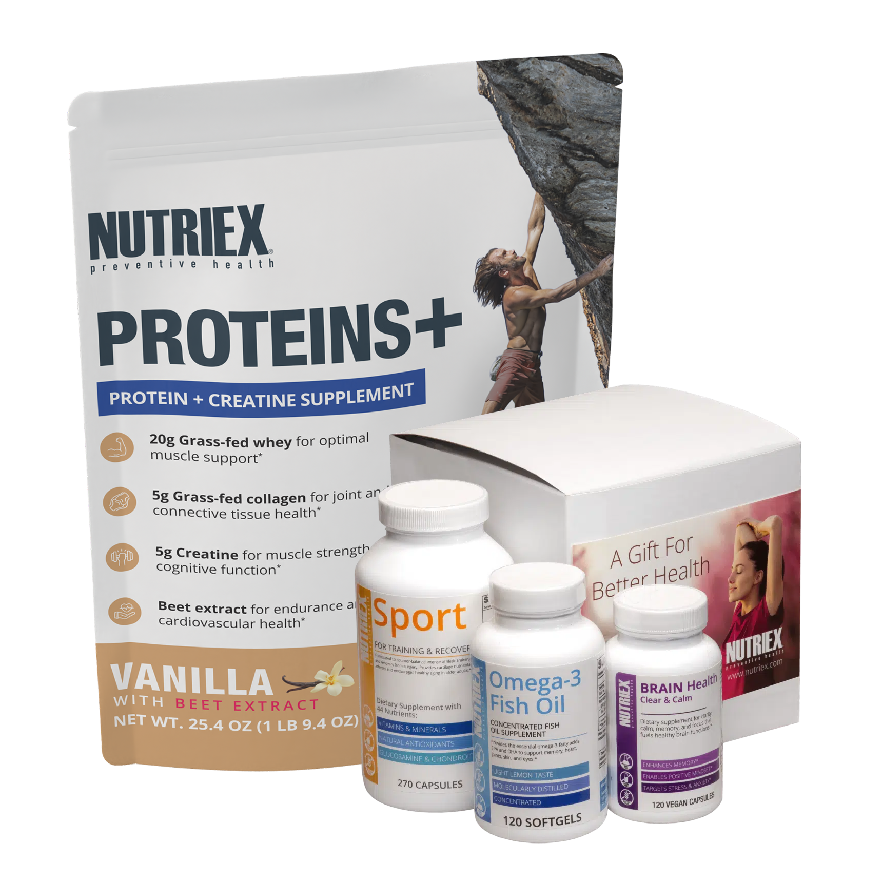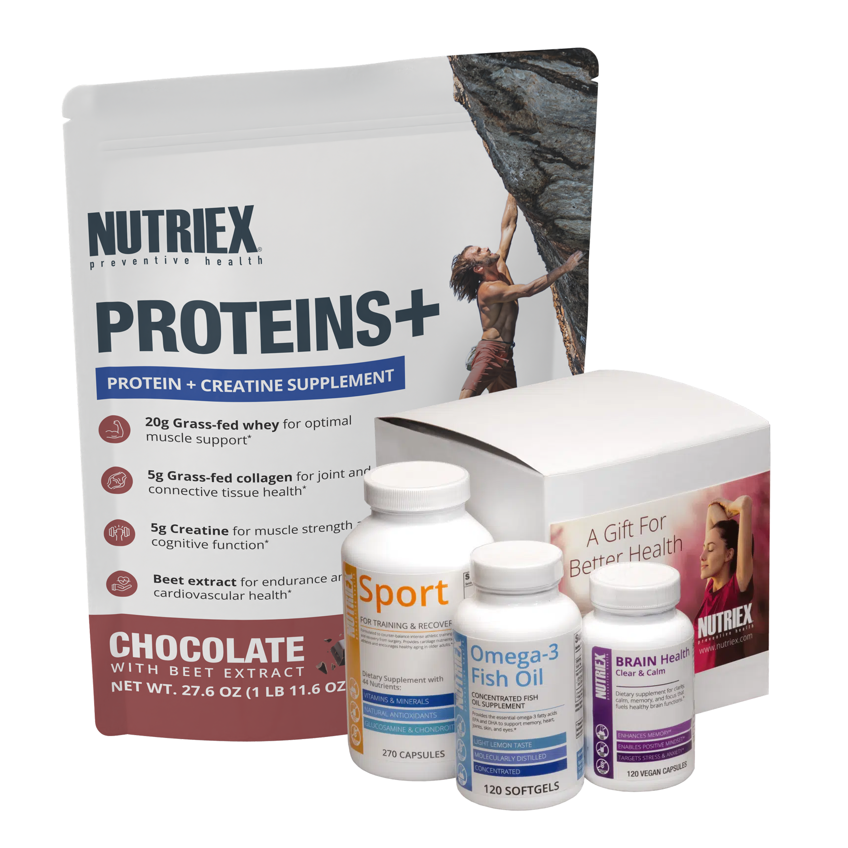 Give the gift of good health with a Nutriex Gift Box. Each box contains Nutriex Sport, a large bottle of Omega-3/Fish Oil, and an (optional) bottle of 120 ct Brain Health.